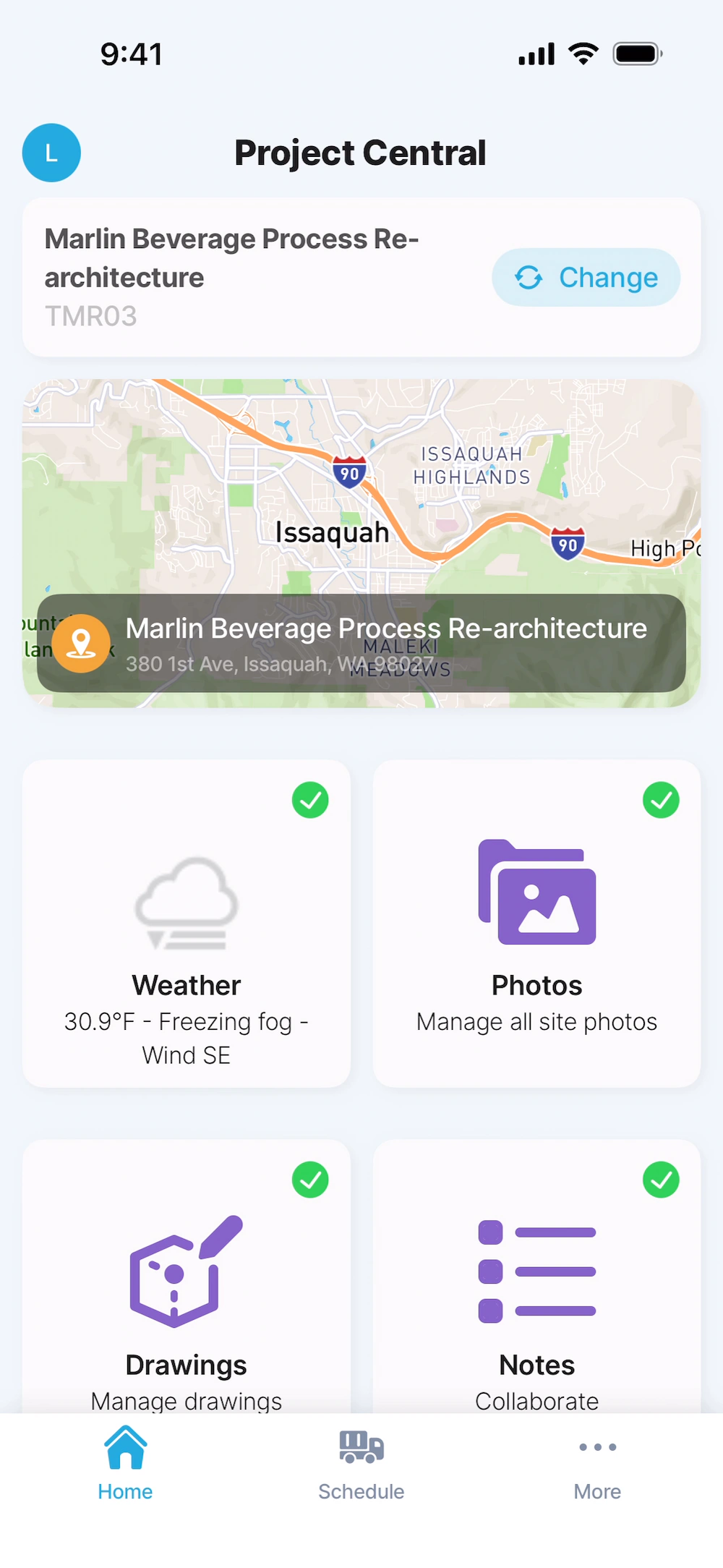 See your project at a glance with key details, such as site location and local weather, right from the start.