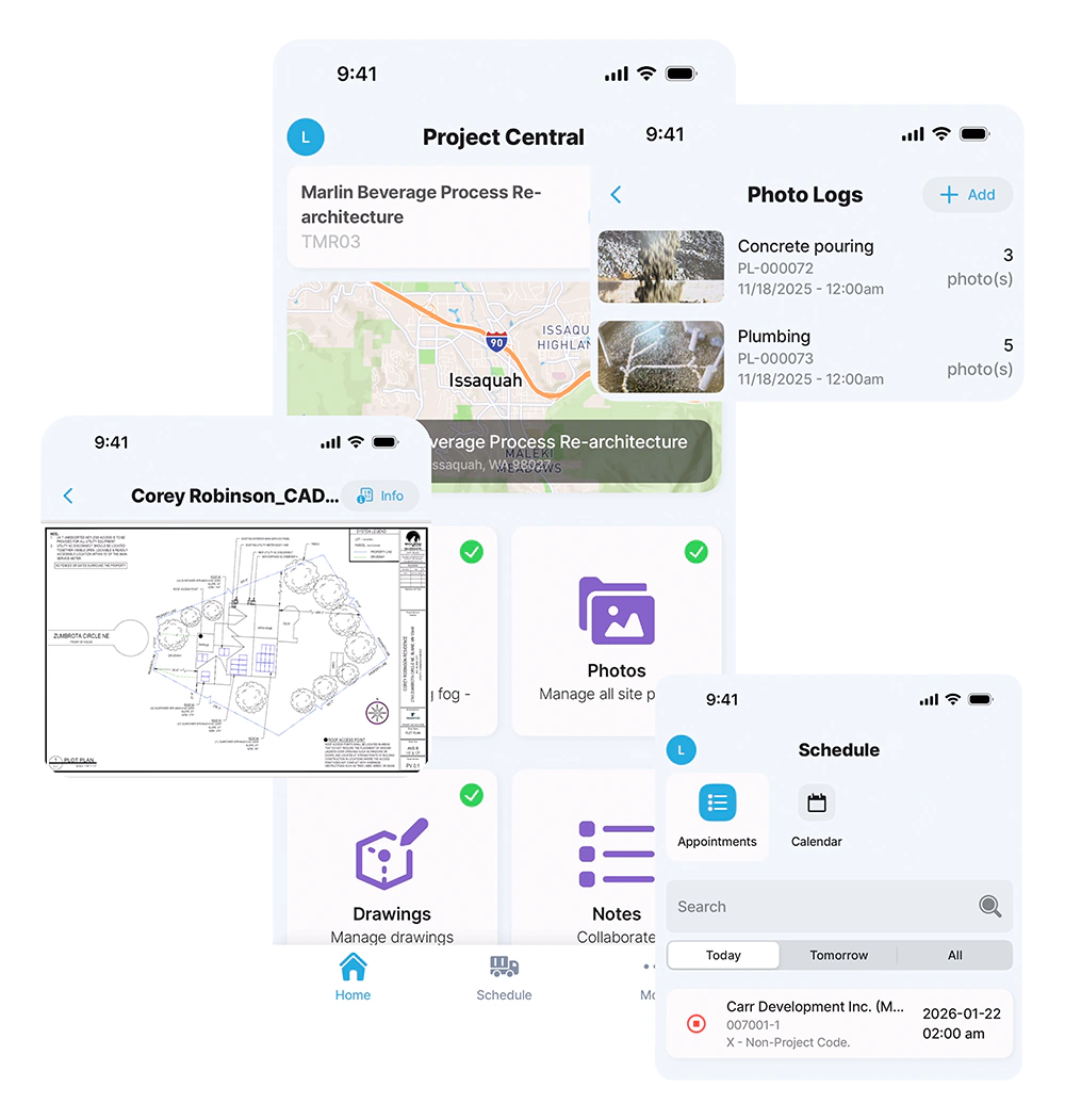 Jigx Project Central brings Acumatica project data to the jobsite. Access drawings, photos, schedules, and notes, even offline.